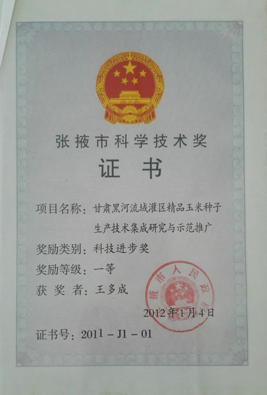 2011榮獲張掖市科技特派員證書