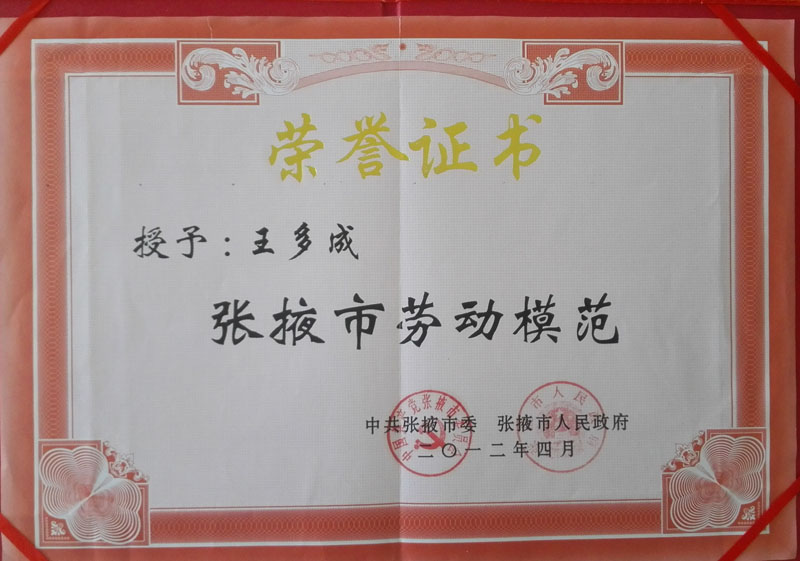 2012年榮獲張掖市勞動(dòng)模范證書